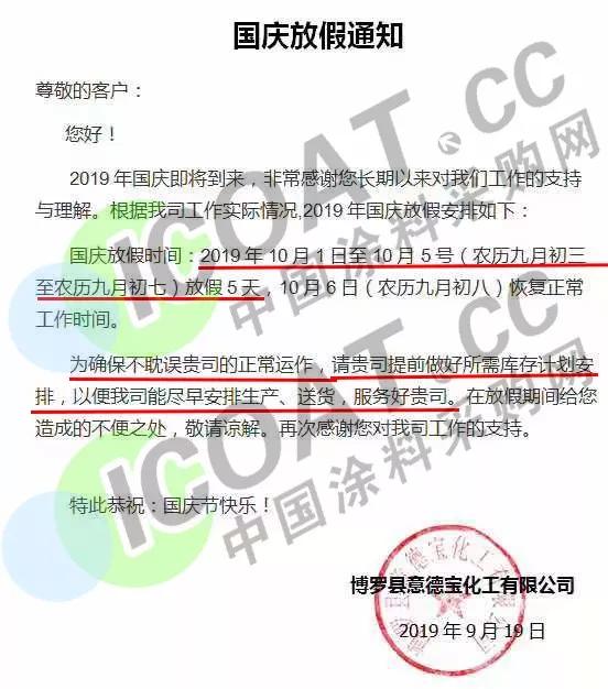 據涂料采購網了解,國慶將至,化工、物流等行業均做好了假期準備。不少化工企業已經部署了假期前后的工作安排并發布通知函,告知客戶提前備貨,以免受到影響。