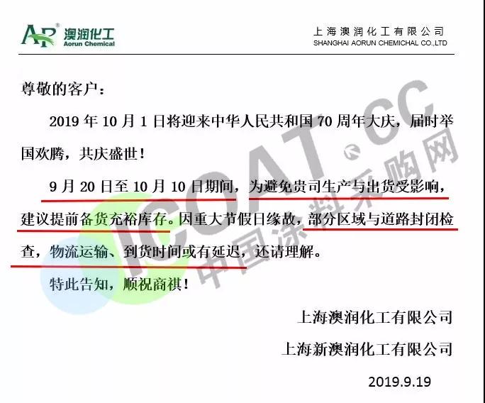 上海澳潤化工有限公司發布通知稱,9月20日至10月10日期間,為避免貴司生產與出貨受影響,建議提前備貨充裕庫存。因重大節假日緣故,部分區域與道路封閉檢查,物流運輸、到貨時間或有延遲,還請理解。