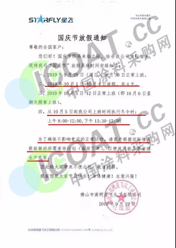 佛山市高明星飛化工有限公司發布通知函稱,9月29日,9月30日正常上班,10月1日至10月4日放假共4天,自10月5日起上班時間執行冬令時,上午8:00-12:00,下午13:30-17:30。并提醒客戶根據實際情況提前做好所需庫存計劃(備貨下單),以便能夠盡早安排。