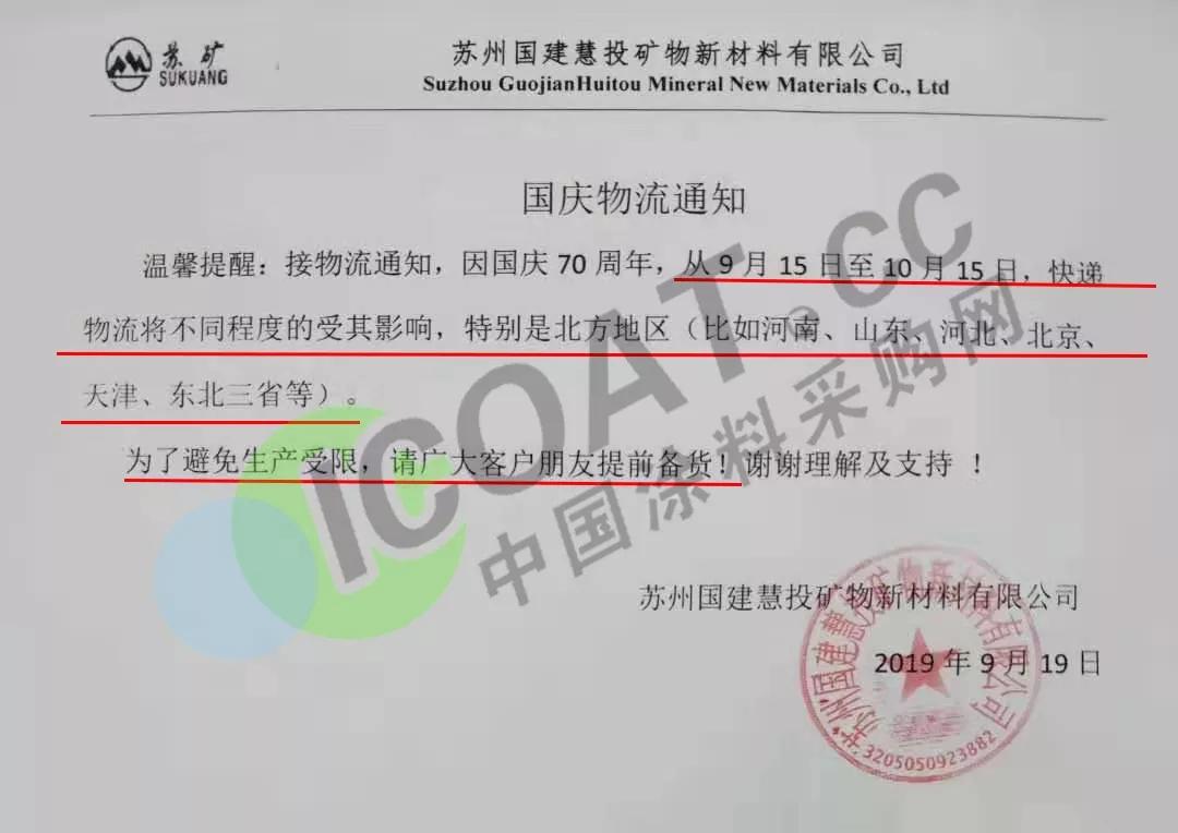 蘇州國建慧投礦物新材料有限公司發布通知稱,從9月15日至10月15日,快遞物流將受到不同程度的影響,特別是北方地區(比如河南、山東、河北、北京、天津、東北三省等),為了避免生產受限,請廣大客戶朋友提前備貨。 除此之外,還有不少化工企業采取口頭通知或即時通訊工具溝通的方式,告知了客戶國慶期間的部分安排,提醒客戶根據自身情況,提前備貨,以免影響正常的生產和運輸。 因假期物流或將受到影響,以及眾多化工企業放假,節前不少企業選擇囤積貨物。下游市場的火爆也刺激了上游化工企業的漲價。