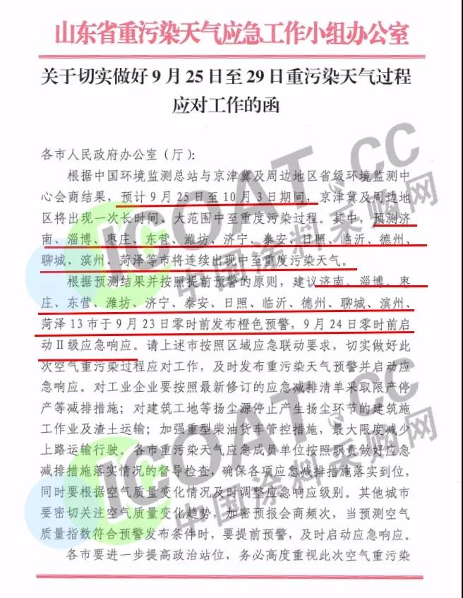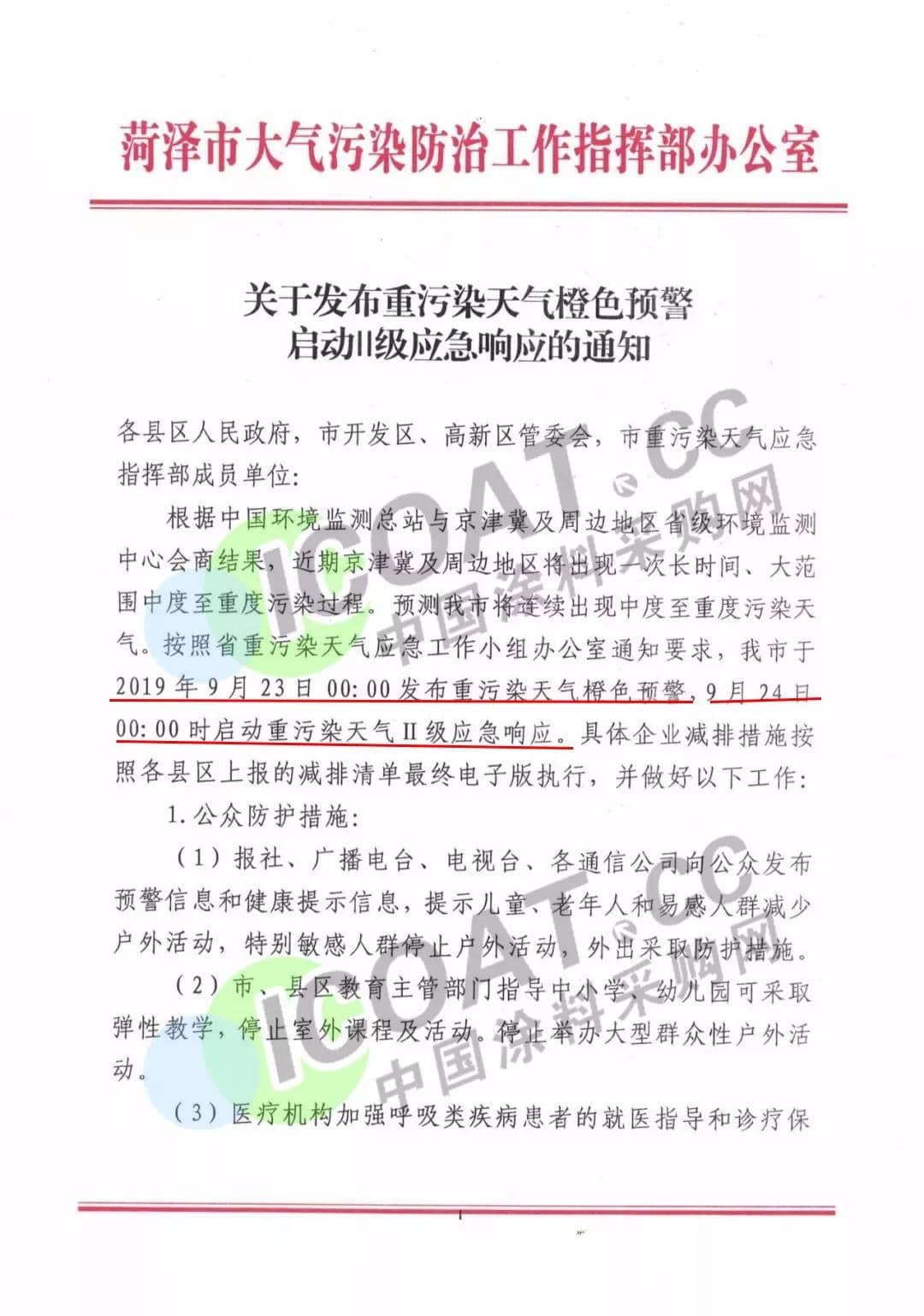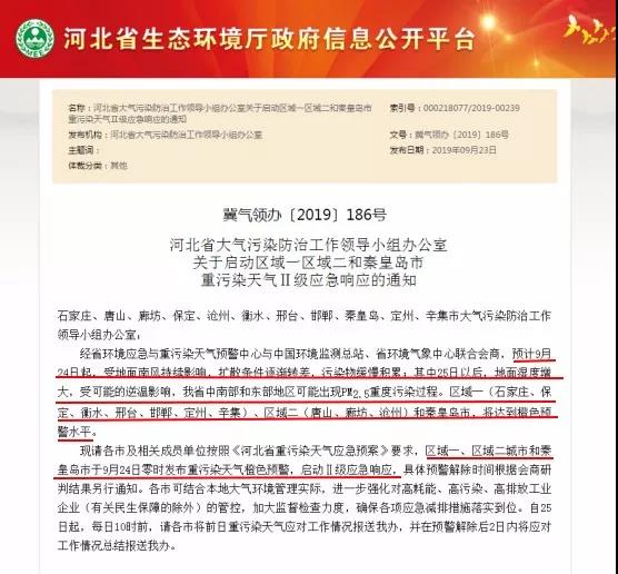 自2019年9月24日0時(shí)起發(fā)布重污染天氣橙色預(yù)警并啟動Ⅱ級應(yīng)急響應(yīng),預(yù)警解除時(shí)間另行通知。