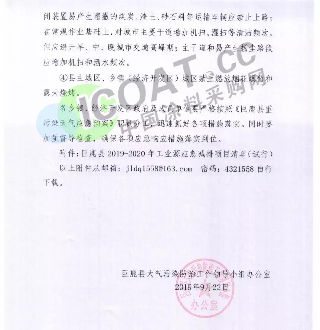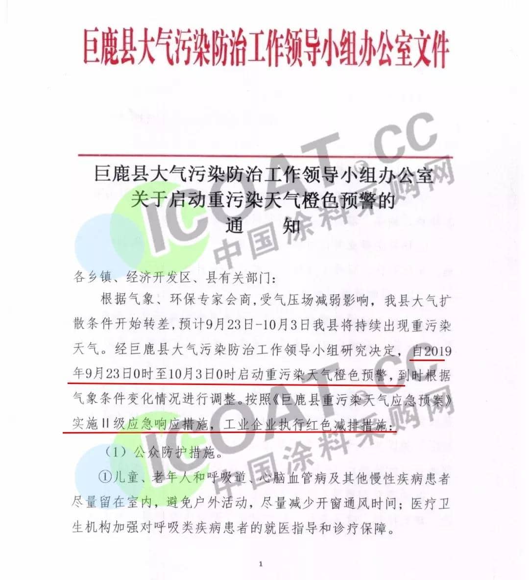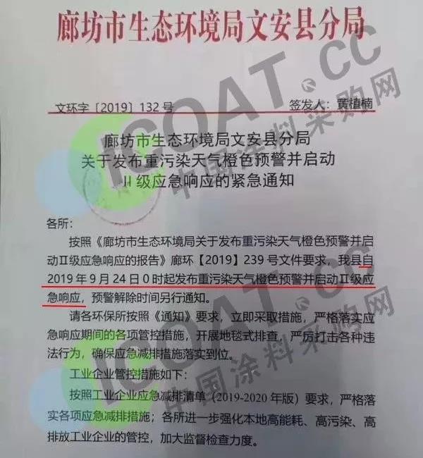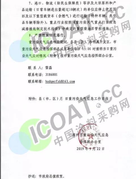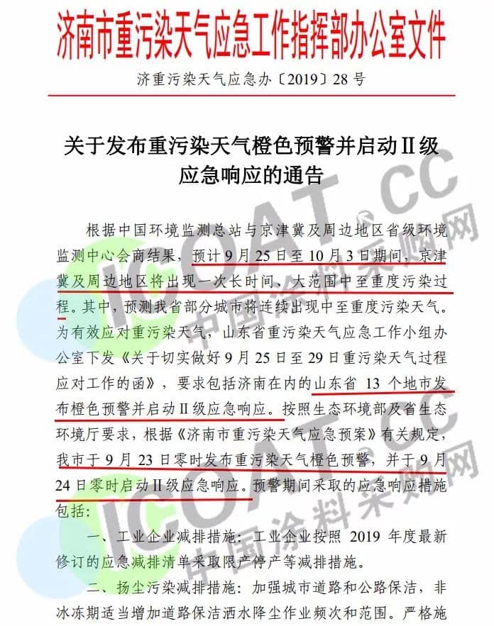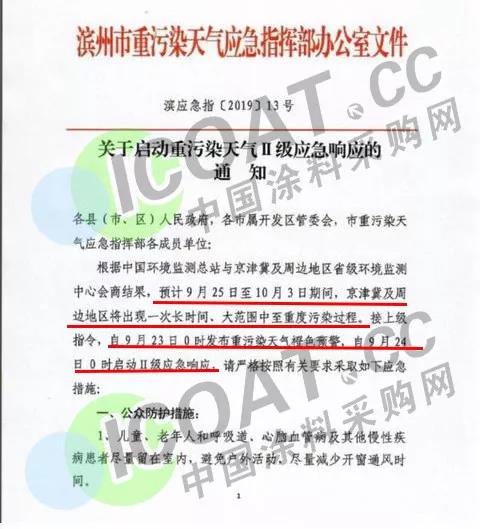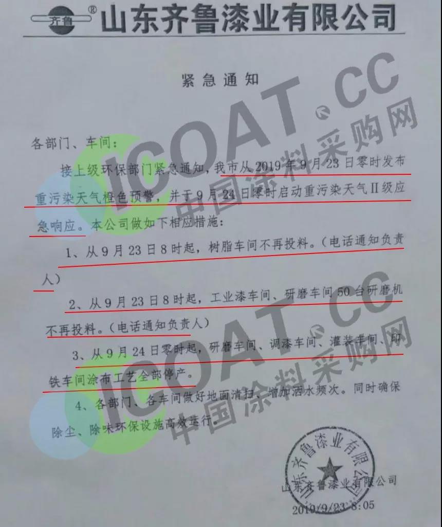 除此之外,山東齊魯漆業(yè)有限公司也發(fā)布了緊急通知,稱由于本市自2019年9月23日零時(shí)發(fā)布重污染天氣橙色預(yù)警,并于9月24日零時(shí)啟動重污染天氣Ⅱ級應(yīng)急響應(yīng),本公司做出如下措施: