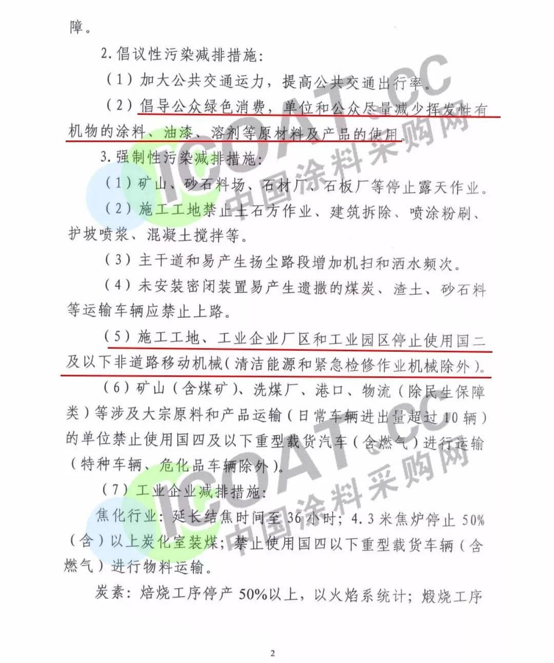 據(jù)涂料采購網(wǎng)了解,近期除了以上河北、山西、山東、河南等省市地區(qū)之外,還有不少地區(qū)陸續(xù)發(fā)布了重污染天氣預(yù)警,部分地區(qū)啟動了應(yīng)急響應(yīng),要求施工工地全面停止噴涂粉刷、護(hù)坡噴漿等,對VOCs實(shí)施減排工作,對于化工等涉塵涉氣企業(yè)也做出了相應(yīng)的減排措施和規(guī)定。(涂料采購網(wǎng))