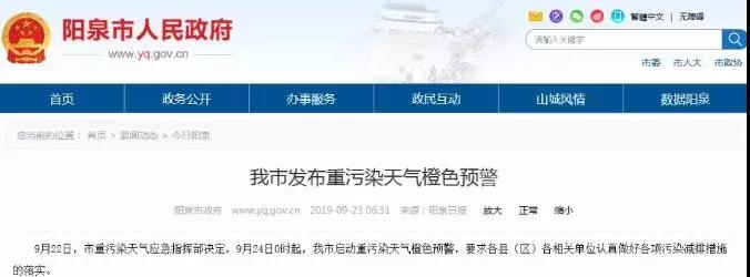 廊坊:自2019年9月24日0時起發布重污染天氣橙色預警并啟動Ⅱ級應急響應,預警解除時間另行通知。