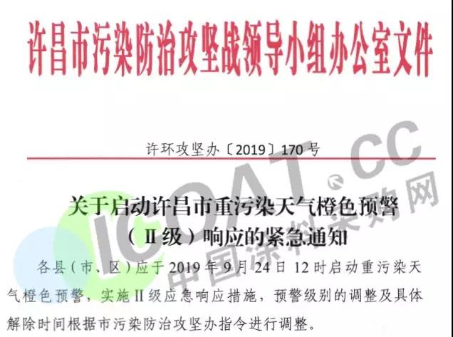 鄭州:自9月24日0時至10月2日24時啟動重污染天氣II級應急響應。工業企業按照2019—2020年秋冬季重污染天氣應急響應行業“一廠一策”停限產措施橙色預警要求,實施停產或限產。 開封:2019年9月24日0時啟動紅色預警(Ⅰ級)響應(預警解除時間另行通知)。落實揮發性有機物的減排比例達到全社會排放量占比的30%以上。施工工地、工業企業廠區和工業園區內應停止使用國二及以下非道路移動機械(清潔能源和緊急檢修作業機械除外)。涂料制造、油墨制造、工業涂裝、包裝印刷等行業涉揮發性有機物工序實施停產;有機化工等行業實施停產。施工工地應停止噴涂粉刷、護坡噴漿等作業。 鶴壁:自9月24日0時起啟動重污染天氣II級(橙色)預警應急響應。施工工地、工業企業廠區和工業園區內應禁止使用不達標非道路移動機械。