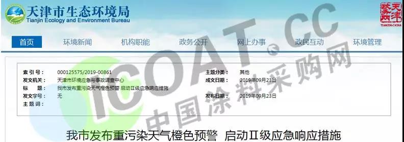 邯鄲:自2019年9月23日24時起,發布重污染天氣橙色預警啟動II級應急響應強化措施,化工、涂裝、印刷等涉塵、涉氣排放重點行業企業全部停產。所有施工工地停止一切室外施工作業,室內施工不得進行涉塵、涉氣作業。 唐山豐潤:9月24日0時全區啟動重污染天氣II級應急響應。家具行業調漆、供漆、涂裝、等涉VOCs排放工序停產。施工工地、工業企業廠區和工業園區內停止使用國二及以下非道路移動機械。施工工地停止噴涂粉刷、護坡噴漿等。