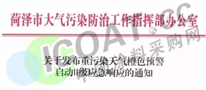 菏澤:自9月23日00:00發布重污染天氣橙色預警,9月24日00:00啟動重污染天氣II級應急響應。涂料制造等涉VOCs排放工序停產,禁止使用國四及以下重型載貨車輛(含燃氣)進行物料運輸。油墨制造等涉VOCs排放工序停產。 家具制造行業,使用非溶劑型涂料的家具企業實施停產50%(含)以上,以生產線計。使用溶劑型涂料的家具企業實施停產。使用溶劑型涂料的企業調漆、供漆、涂裝、干燥/烘干等涉VOCs排放工序停產;禁止使用國四及以下重型載貨車輛(含燃氣)進行物料運輸。