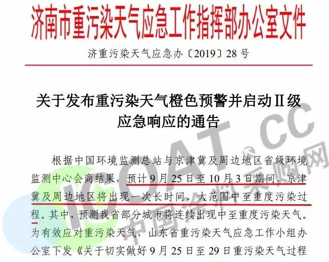濟南:自9月23日零時發布重污染天氣橙色預警,9月24日零時啟動重污染天氣II級應急響應。停止噴涂、粉刷等室內外作業。