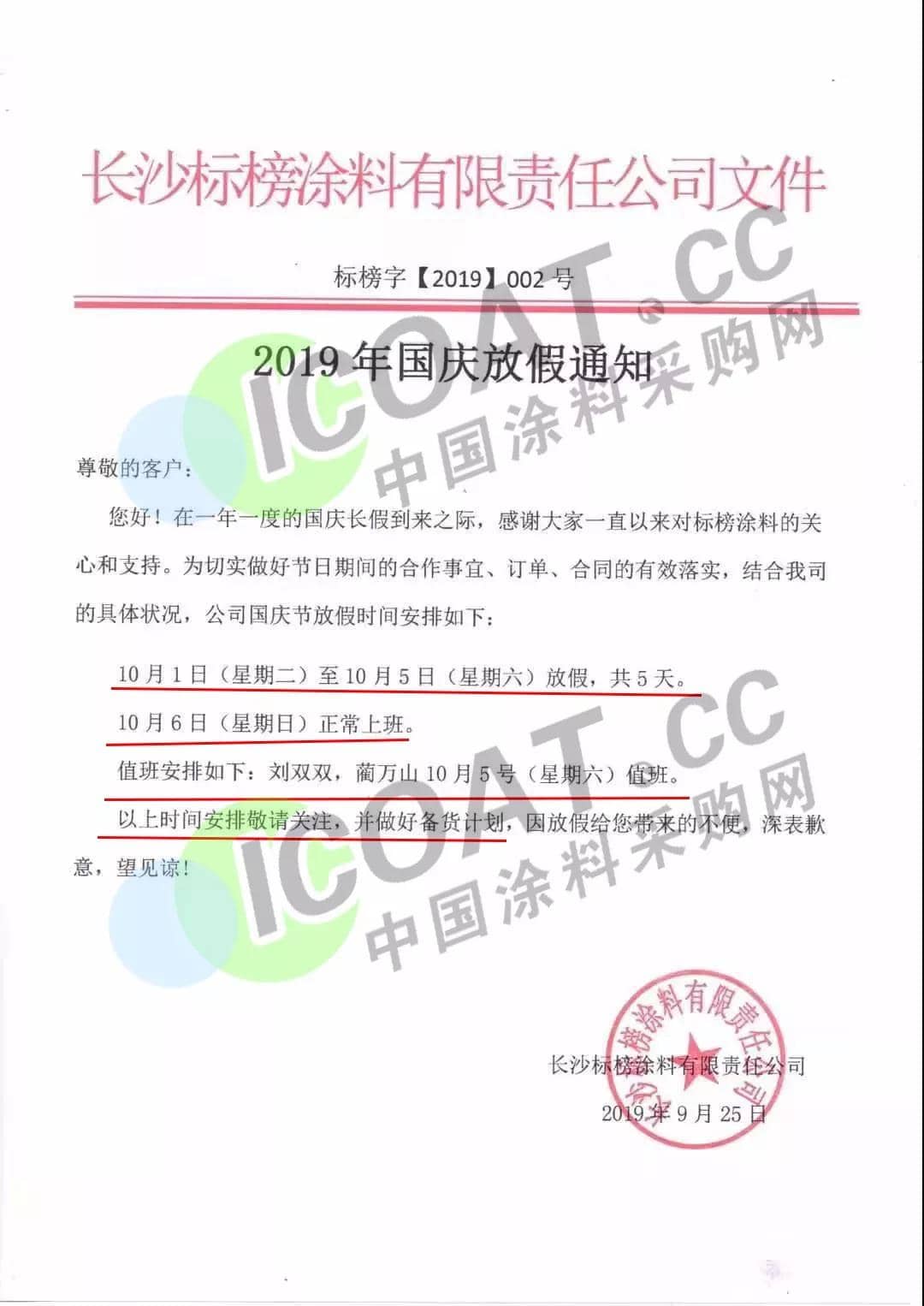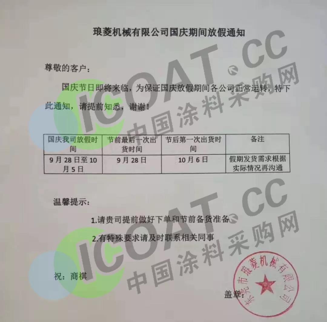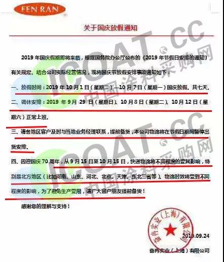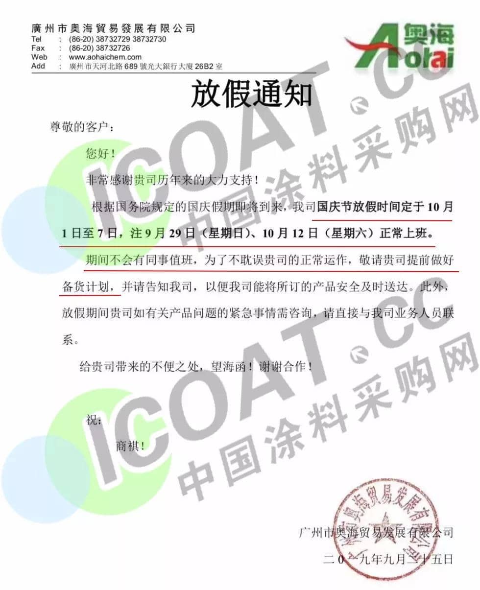 據涂料采購網了解,臨近國慶,眾多化工、涂料企業發布放假通知,稱結合自身情況做出國慶期間放假安排,請客戶提前做好備貨計劃。 9月25日,廣州市奧海貿易發展有限公司發布通知稱,國慶節放假時間定于10月1日至7日,9月29日(星期日)、10月12日(星期六)正常上班。期間不會有同事值班,為了不耽誤貴司的正常運作,敬請貴司提前做好備貨計劃。