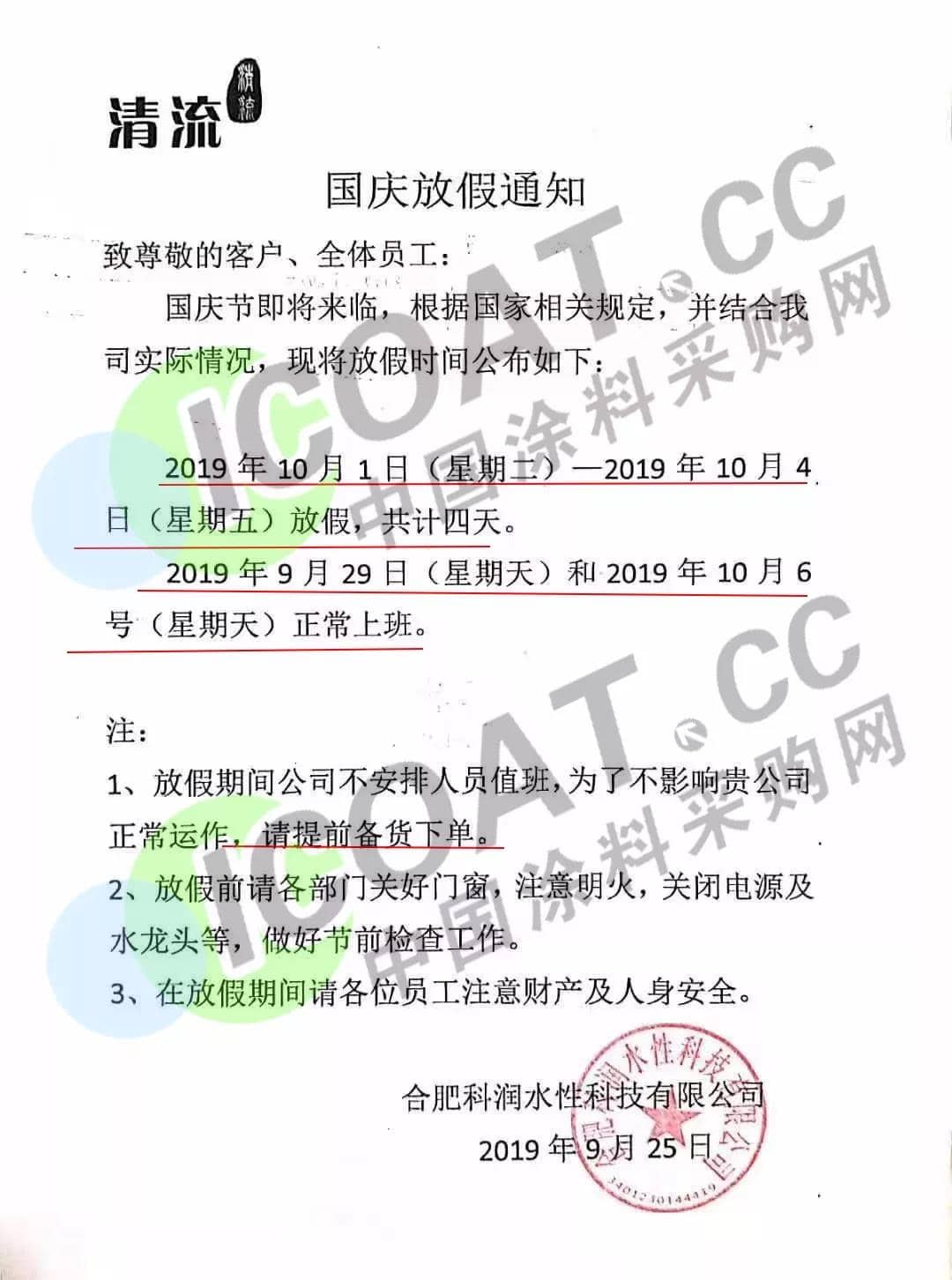 9月25日,合肥科潤水性科技有限公司發布通知稱,10月1日(星期二)——10月4日(星期五)放假,共計四天。9月29日(星期天)和10月6號(星期天)正常上班。放假期間不安排人員值班,為了不影響客戶正常運作,請提前備貨下單。
