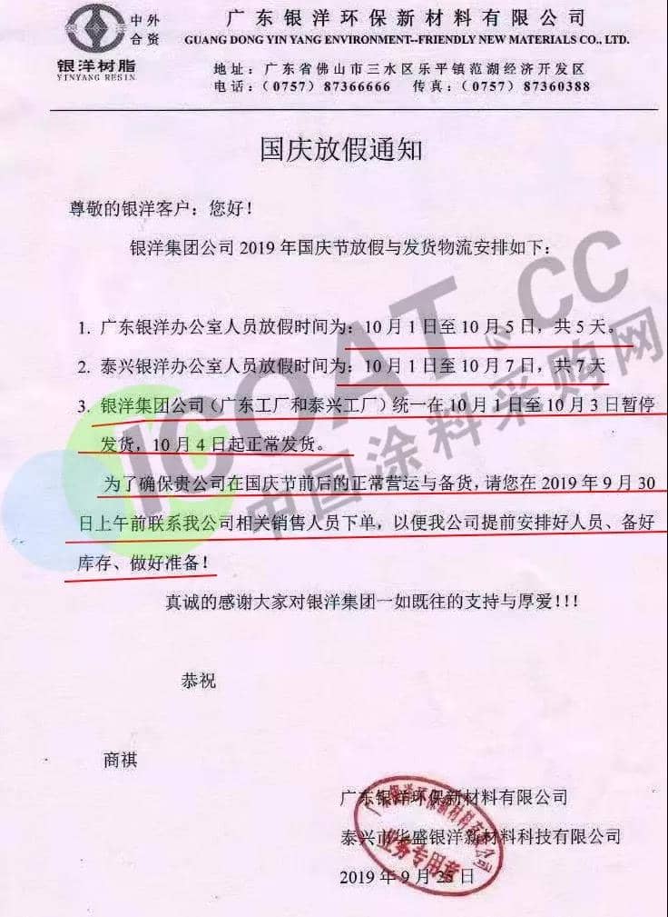 9月25日,廣東省銀洋環保新材料有限公司發布通知稱,10月1日至10月5日,共放假5天,泰興市華盛銀洋新材料科技有限公司發布通知稱,10月1日至10月7日,共放假7天,銀洋集團公司(廣東工廠和泰興工廠)統一在10月1日至10月3日暫停發貨,10月4日起正常發貨。為了確保貴公司在國慶節前后的正常營運與備貨,請在9月30日上午前聯系相關銷售人員下單,以便提前安排好人員、備好庫存、做好準備。
