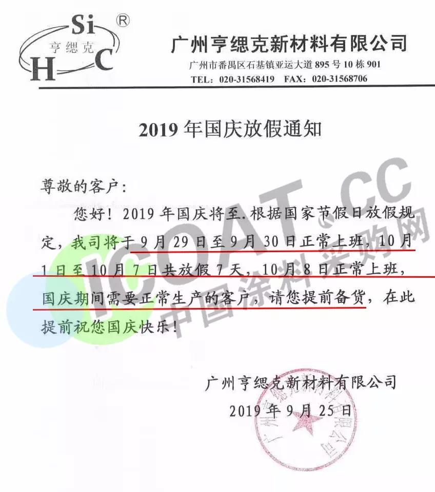9月25日,廣州亨緦克新材料有限公司發布通知稱,將于9月29日至9月30日正常上班,10月1日至10月7日共放假7天,10月8日正常上班,國慶期間需要正常生產的客戶請提前備貨。