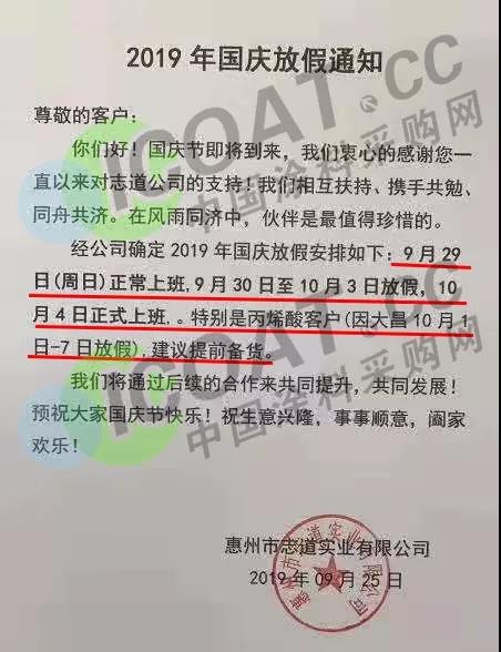 9月25日,惠州市志道實業有限公司發布通知稱,9月29日(周日)正常上班,9月30日至10月3日放假,10月4日正式上班。特別是丙烯酸客戶(因大昌10月1日-7日放假),建議提前備貨。