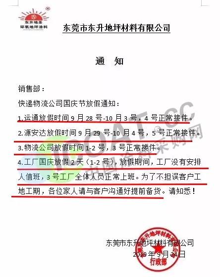 9月24日,東莞市東升地坪材料有限公司發布通知稱,快遞物流公司國慶節放假通知: