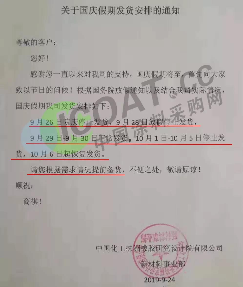 9月24日,中國化工株洲橡膠研究設計院有限公司發布通知稱,9月26日院慶停止發貨,9月28日放假停止發貨,9月29日-9月30日正常發貨,10月1日-10月5日停止發貨,10月6日起恢復發貨。請客戶根據需求情況提前備貨。