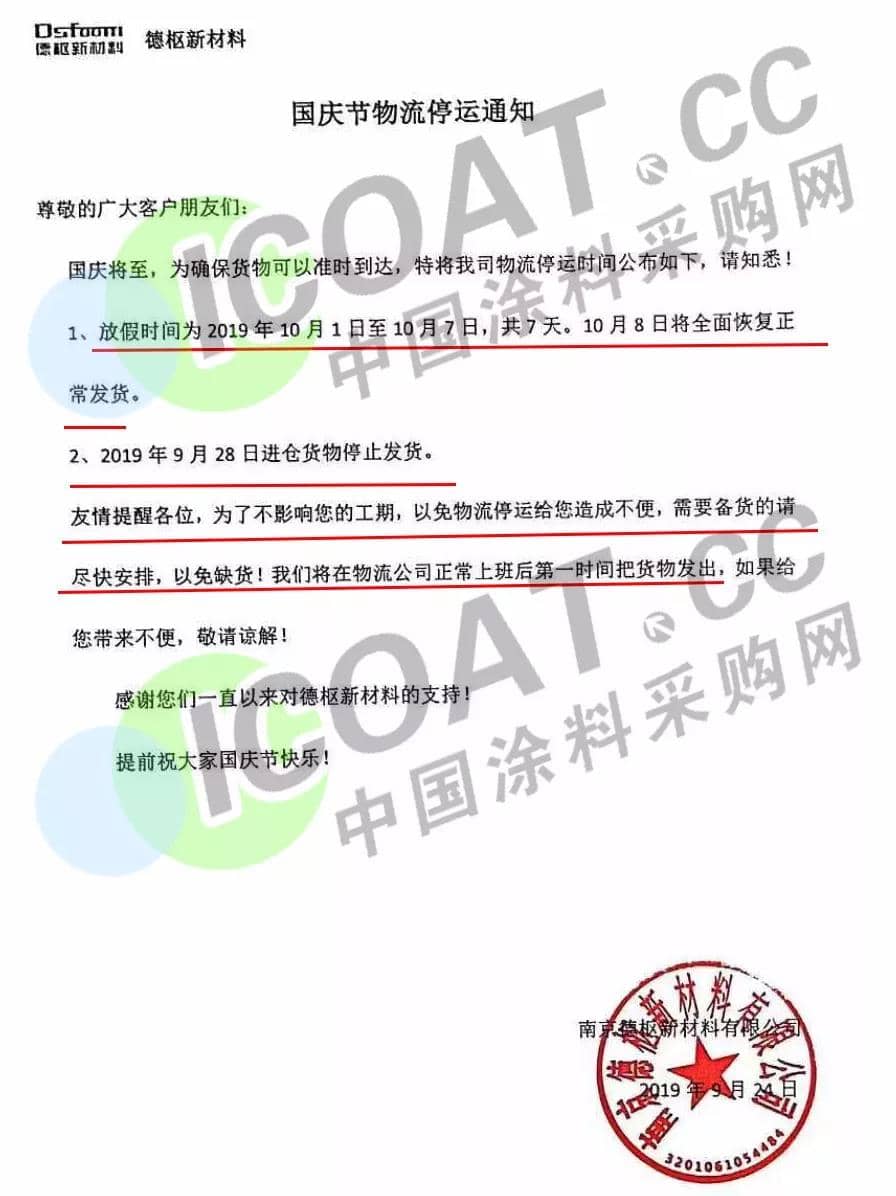 9月24日,南京德樞新材料有限公司發布通知稱,10月1日至10月7日,共放假7天。10月8日將全面恢復正常發貨。9月28日進倉貨物停止發貨。提醒客戶為了不影響工期,以免物流停運造成不便,需要備貨的請盡快安排,以免缺貨。