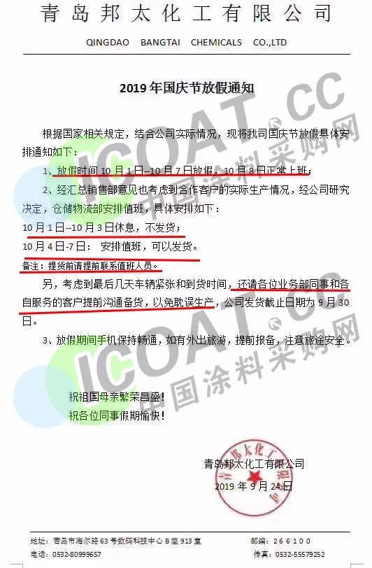 9月24日,青島邦太化工有限公司發布通知稱,10月1日-10月7日放假,10月8日正常上班;倉儲物流部安排值班,10月1日-10月3日休息,不發貨;10月4日-7日:安排值班,可以發貨。提貨前請提前聯系值班人員。發貨截止日期為9月30日。