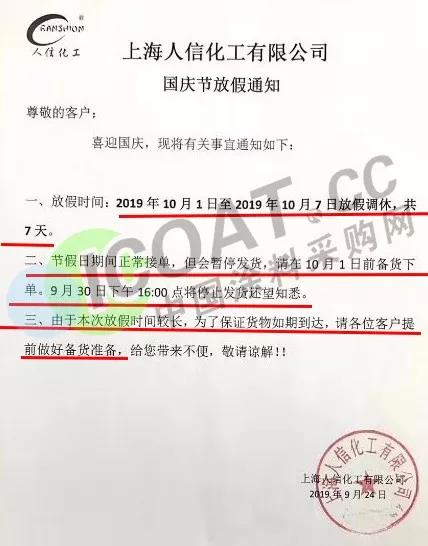 9月24日,上海人信化工有限公司發布通知稱,10月1日至10月7日放假調休,共7天。節假日期間正常接單,但會暫停發貨,請在10月1日前備貨下單。9月30日下午16:00點將停止發貨,請各位客戶提前做好備貨準備。