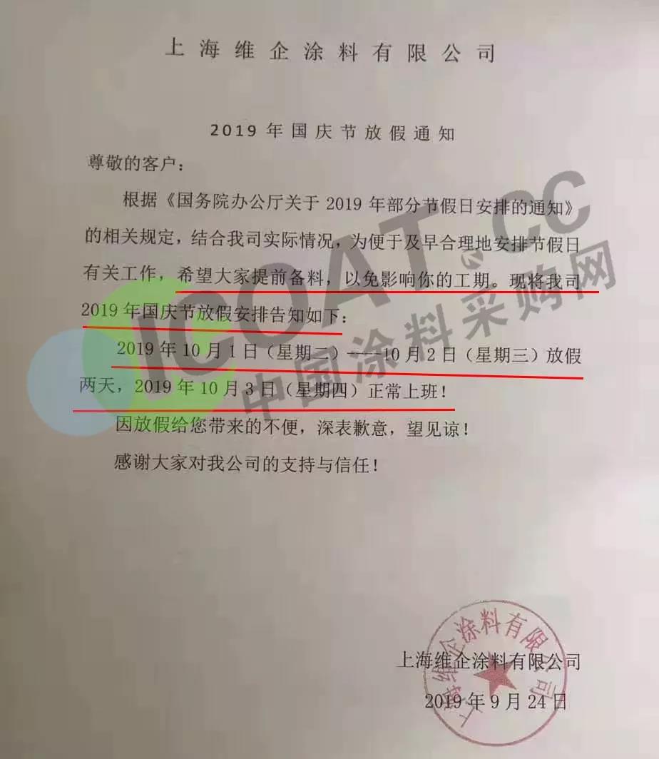 9月24日,上海維企涂料有限公司發布通知稱,10月1日(星期二)——10月2日(星期三)放假兩天,10月3日(星期四)正常上班,提醒客戶提前備料。
