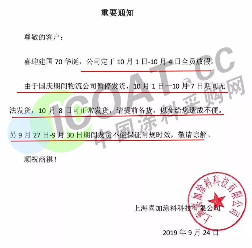 9月24日,上海喜加涂料有限公司發布通知稱,定于10月1日-10月4日全員放假。10月1日一10月7日期間無法發貨,10月8日可正常發貨,請提前備貨,另9月27日-9月30日期間發貨不能保證常規時效,敬請諒解。