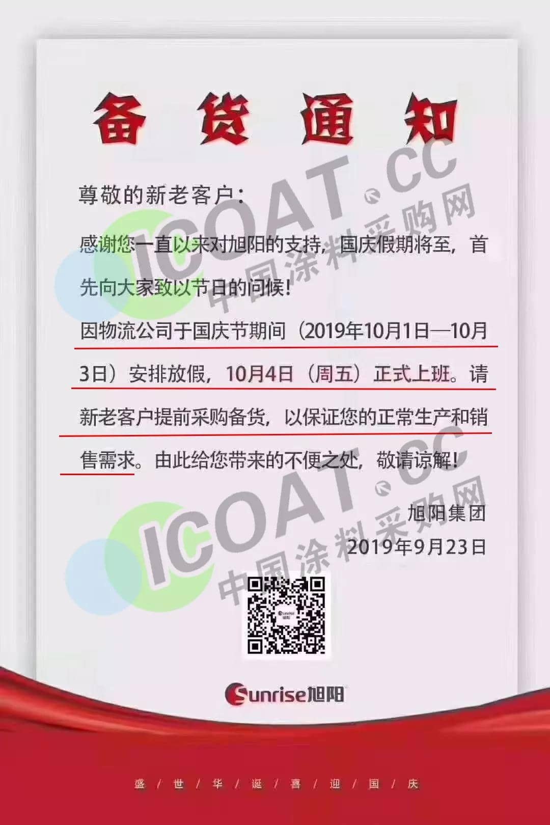 9月23日,旭陽集團發布通知稱,因物流公司于國慶節期間(10月1日-10月3日)安排放假,10月4日(周五)正式上班。請新老客戶提前采購備貨,以保證正常生產和銷售需求。
