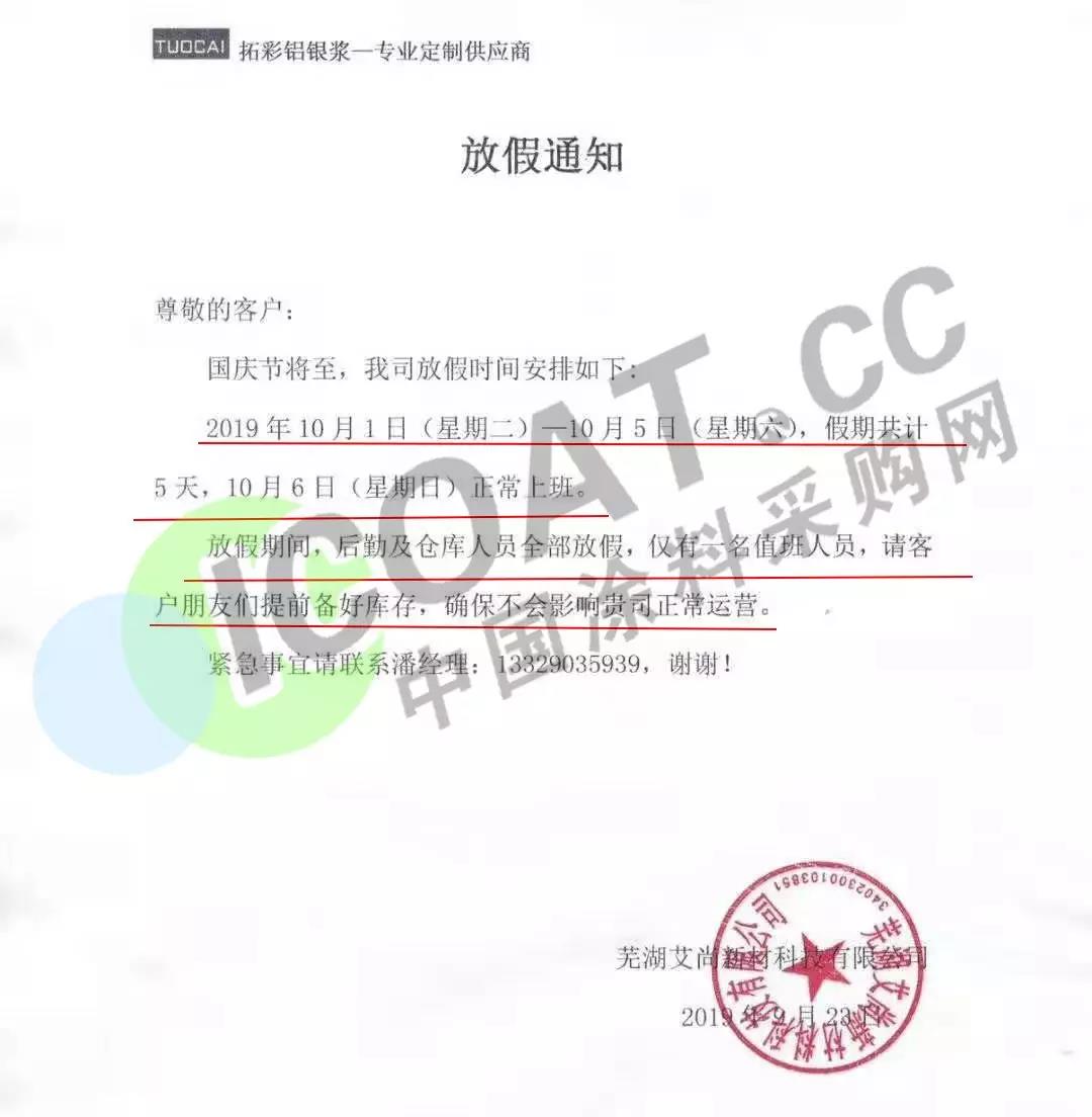 9月23日,蕪湖艾尚新材料科技有限公司發布通知稱,10月1日(星期二)一10月5日(星期六),假期共計5天,10月6日(星期日)正常上班。放假期間,后勤及倉庫人員全部放假,僅有一名值班人員,請客戶朋友們提前備好庫存,確保不會影響貴司正常運營。