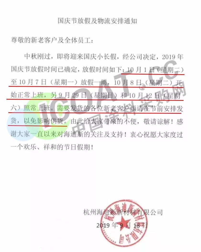 9月18日,杭州海迪斯新材料有限公司發布通知稱,10月1日(星期二)至10月7日(星期一)放假一周,10月8日(星期二)開始正常上班,另9月29日(星期日)和10月12日(星期六)照常上班。需要發貨的各位新老客戶煩請在節前安排發貨,以免影響供貨。