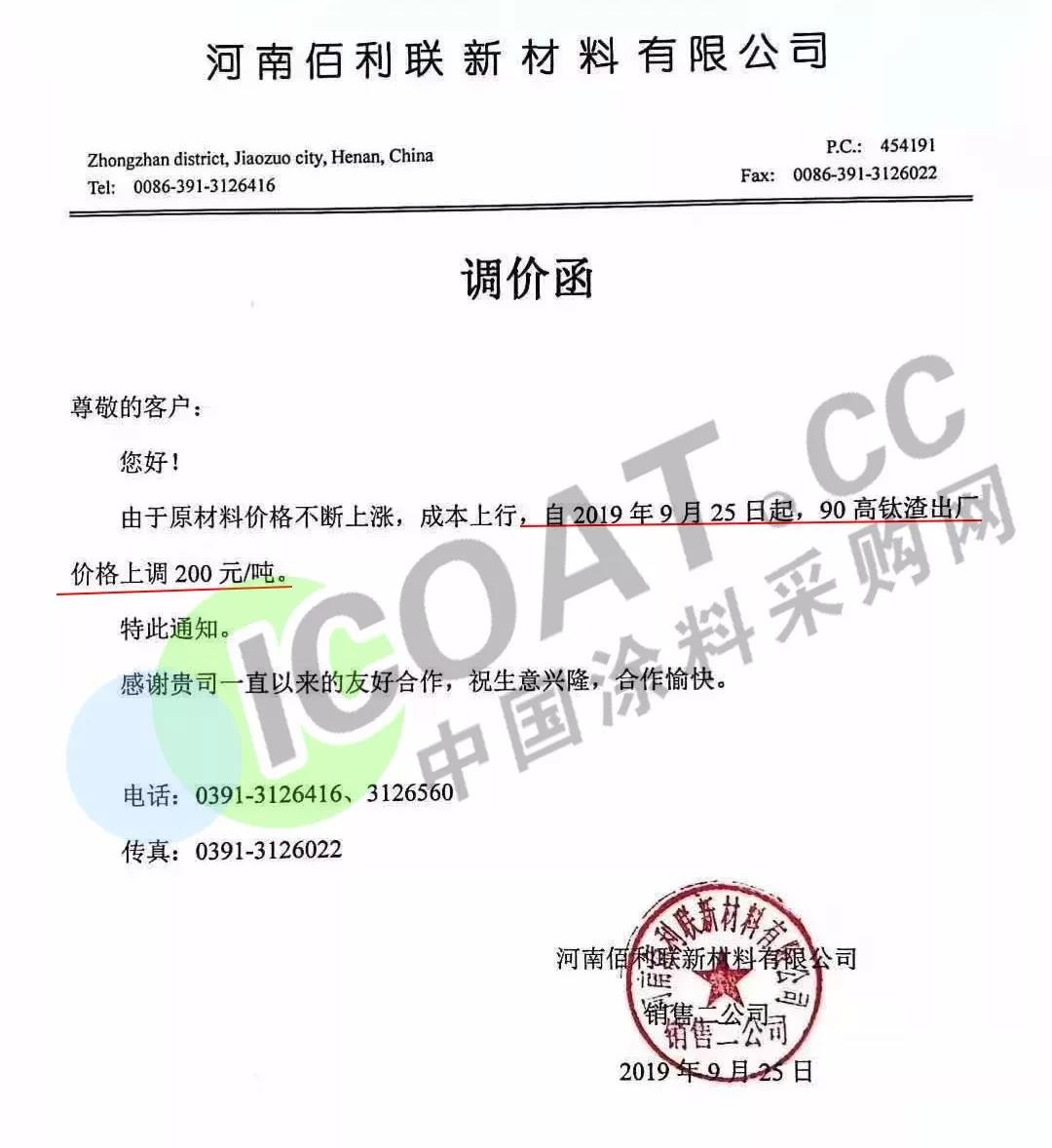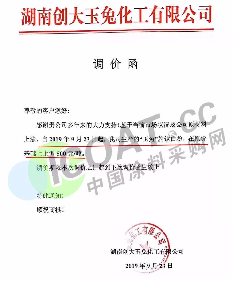 9月23日,湖南創大玉兔化工有限公司發布調價函稱,自9月23日起,我司生產的“玉兔”牌鈦白粉,在原價基礎上上調500元/噸。