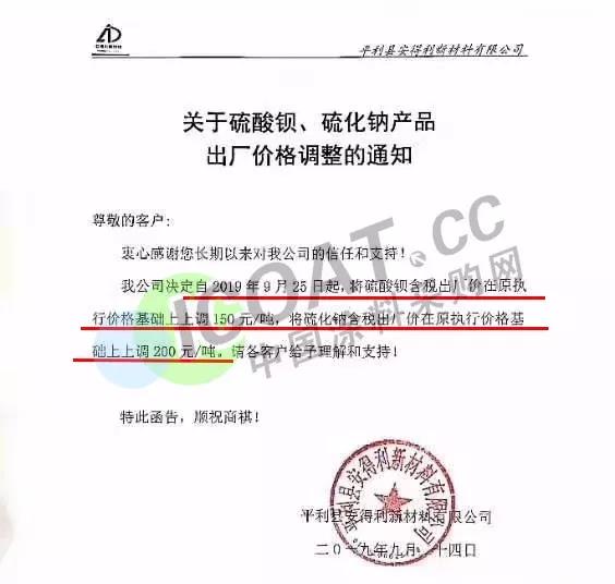 9月24日,平利縣安得利新材料有限公司發布通知稱,自9月25日起,將硫酸鋇含稅出廠價在原執行價格基礎上上調150元/噸,將硫化鈉含稅出廠價在原執行價格基礎上上調200元/噸。