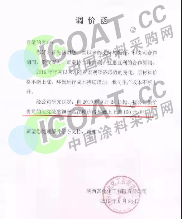 9月24日,山西富化化工有限責任公司發布調價函稱,經研究決定:自9月24日起,供給的沉淀硫酸鋇產品在原價格基礎上上調150元/噸。