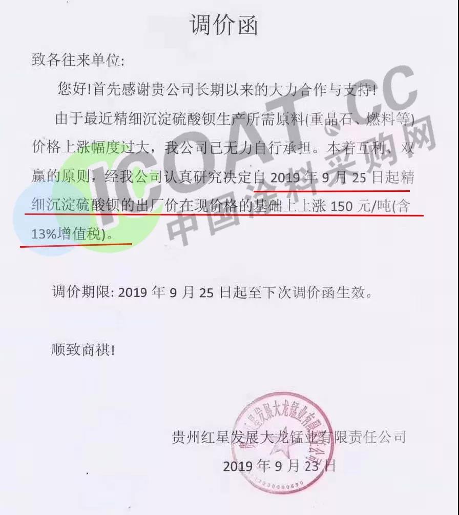 9月23日,貴州紅星發展大龍錳業有限責任公司發布調價函稱,經認真研究決定自9月25日起精細沉淀硫酸鋇的出廠價在現價格的基礎上上漲150元/噸(含13%增值稅)。