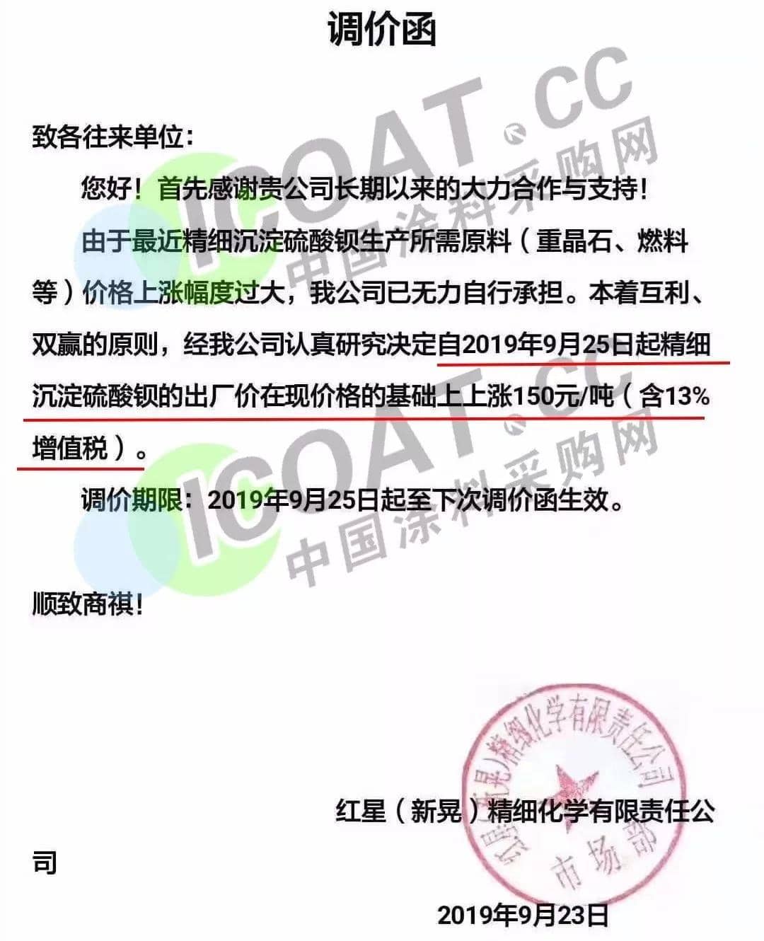 9月23日,紅星(新晃)精細化學有限責任公司發布條件函稱,自9月25日起精細沉淀硫酸鋇的出廠價在現價格的基礎上上漲150元/噸(含13%增值稅)。