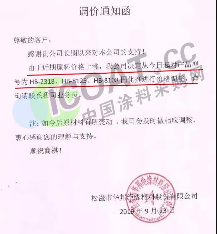 9月23日,松滋市華邦絕緣材料股份有限公司發布調價函稱,由于近期原料價格上漲,從今日起對產品型號為HB-2318、HB-8125、HB-8108固化劑進行價格調整。