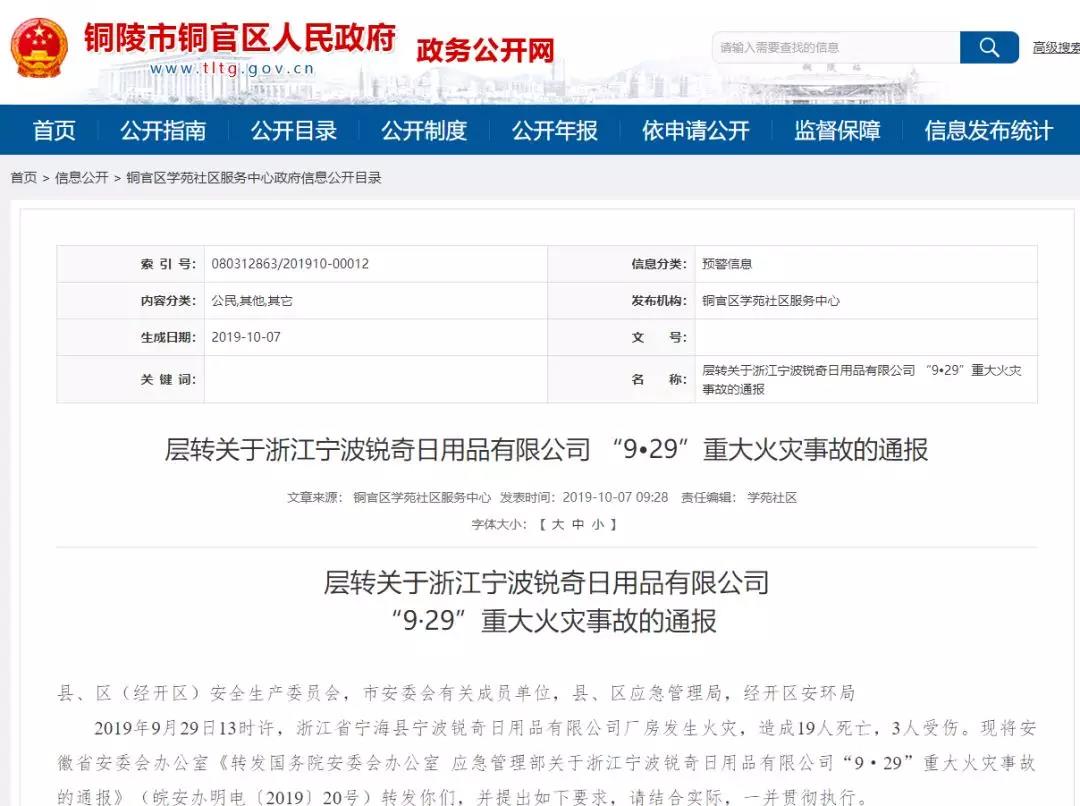 10月6日,浙江省應急管理廳發布了《浙江省安全生產委員會關于深刻吸取事故教訓切實加強小微企業安全生產和消防工作的通知》,稱省政府立即成立了“9•29”重大火災事故調查組,對該起事故開展調查工作,并要求各級各部門認真吸取教訓,全面落實風險管控,持續推進整治工作。