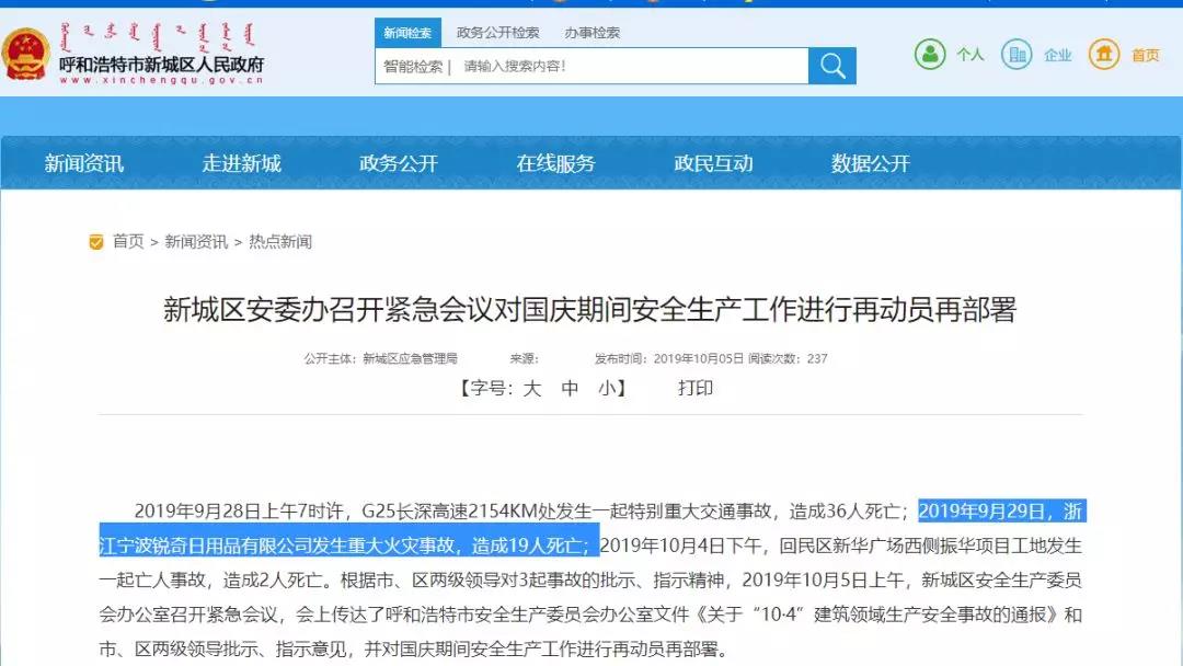 10月5日內蒙古呼和浩特市新城區人民政府轉發新城區應急管理部消息稱,2019年9月28日上午7時許,G25長深高速2154KM處發生一起特別重大交通事故,造成36人死亡;2019年9月29日,浙江寧波銳奇日用品有限公司發生重大火災事故,造成19人死亡;2019年10月4日下午,回民區新華廣場西側振華項目工地發生一起亡人事故,造成2人死亡。根據市、區兩級領導對3起事故的批示、指示精神,2019年10月5日上午,新城區安全生產委員會辦公室召開緊急會議,會上傳達了呼和浩特市安全生產委員會辦公室文件《關于“10·4”建筑領域生產安全事故的通報》和市、區兩級領導批示、指示意見。