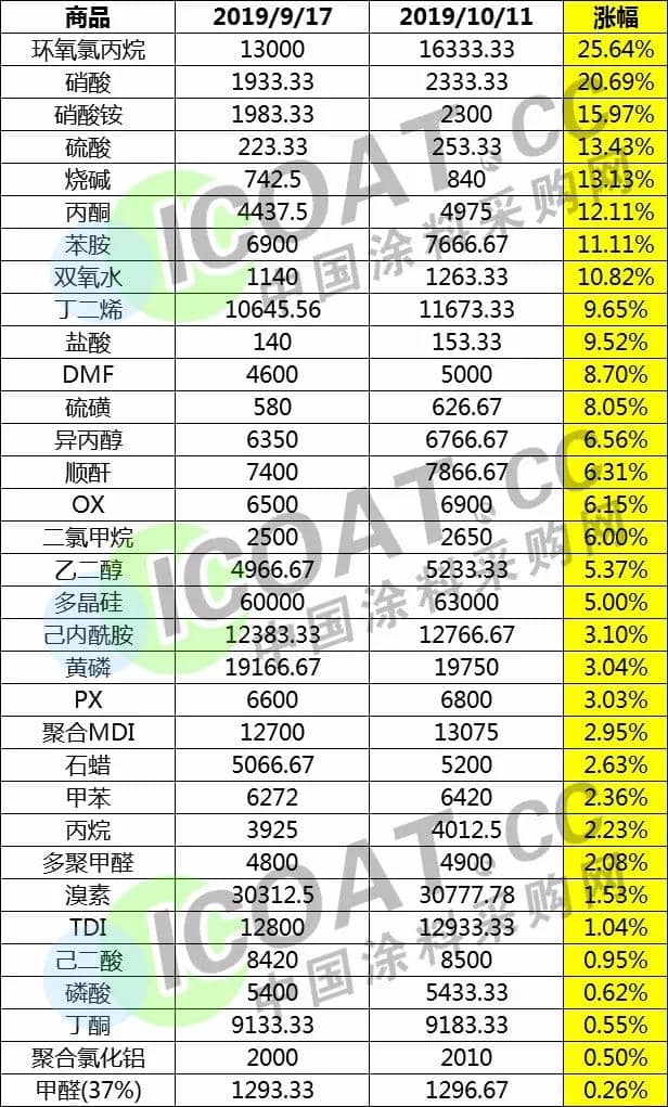 通過以上表格數據可以看出,近期共33種原材料價格上漲,在此次統計數據中占42%。其中漲幅最高的為環氧氯丙烷,價格上漲25.64%,其于2019年價格變動非?;钴S。硝酸和硝酸銨緊隨其后,漲幅分別為20.69%和15.97%。 10月12日市場獲悉,滄州大化TDI一口價上調至13200元/噸。 10月12日,華北地區鹽酸主流出廠價格微漲:德州邁化報價60元/噸,報價微漲,漲幅10元/噸。 10月12日,山東華魯恒升液氨報價調漲50元/噸,報價3050元/噸。 10月12日,山東舜天液氨價格報價調漲50元/噸,價格3650元/噸。 10月11日市場獲悉,萬華化學本周TDI掛牌價執行14500元/噸,上調500元/噸,節前結算12700元/噸?! ?0月11日,上海巴斯夫TDI 10月份掛牌價格17000元/噸(桶裝),環比上調1000元/噸。 10月11日,山東海右石化集團有限公司(晨曦)丙烯最新報價上調,漲150元/噸至7600元/噸。 10月11日,江蘇新海石化有限公司聚合級丙烯報價上調,漲50元/噸至7600元/噸?! ?0月11日,山東東明石化集團(潤昌)氣分含硫裝置丙烯最新報價上調50元/噸至7450元/噸,山東東明石化集團(前海)混烷脫氫裝置丙烯最新報價上調50元/噸至7600元/噸。 除了巴斯夫、萬華化學、滄州大化之外,還有不少企業、地區等提高了化工原材料的價格。據業內人士稱,近期國際政局的動蕩對國內市場產生的影響較大,部分化工企業的原材料漲價也會領漲其他原材料的價格,而國內大部分化工原材料價格的上漲或許只是時間問題。