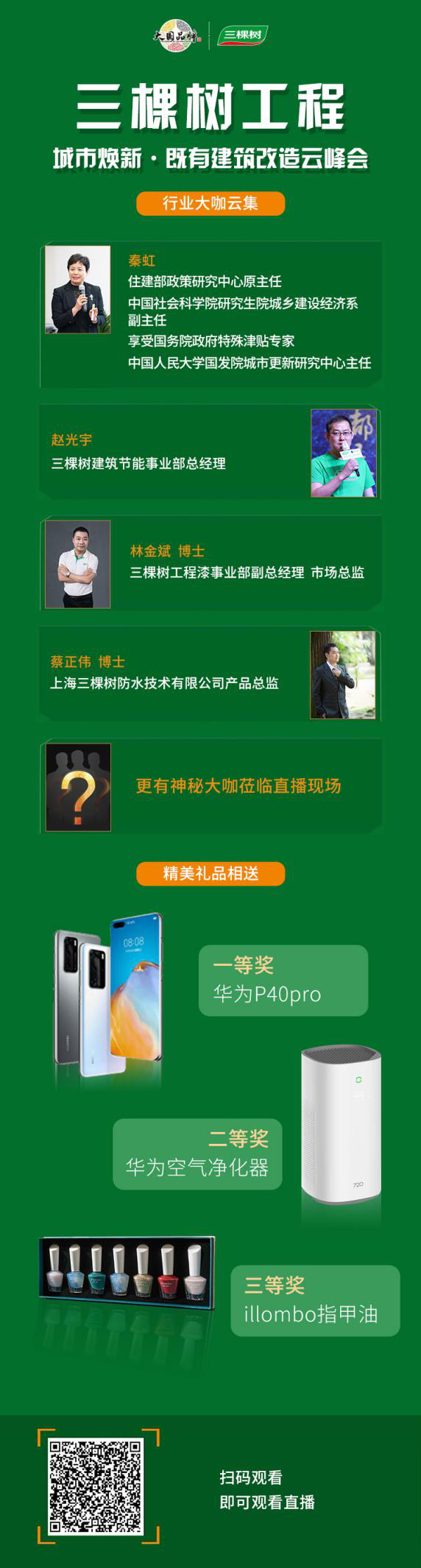 在5月18日當天,三棵樹工程將邀請行業大咖圍繞舊改政策,解析舊改難點,探討城市煥新議題,共同分享智慧結晶,同時直播過程還有華為P40pro、華為空氣凈化器等眾多精美獎品參與抽獎,驚喜連連等你來拿!