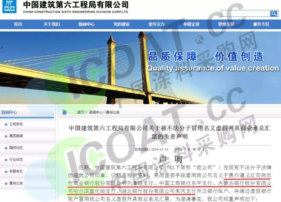 2019年底,中國建筑第六工程局已經在其官網上發布了一則聲明《中國建筑第六工程局有限公司關于被不法分子冒用名義虛假開具商業承兌匯票的免責聲明》。
