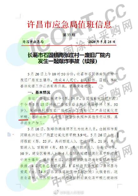 爆炸發生后,消防救援隊伍迅速趕赴現場搶險救援,4名死者已全部找到,1名輕傷員系廢舊廠房鄰居馬愛英(女,74歲,石固鎮南張莊村2組村民)大腿骨折,現在長葛市人民醫院治療?,F場遺留的過氧化苯甲酰已被轉移到安全地方。公安機關已控制張峰偉、師萬立、張建華等3名有關人員。相關善后處置和調查工作正有序進行。