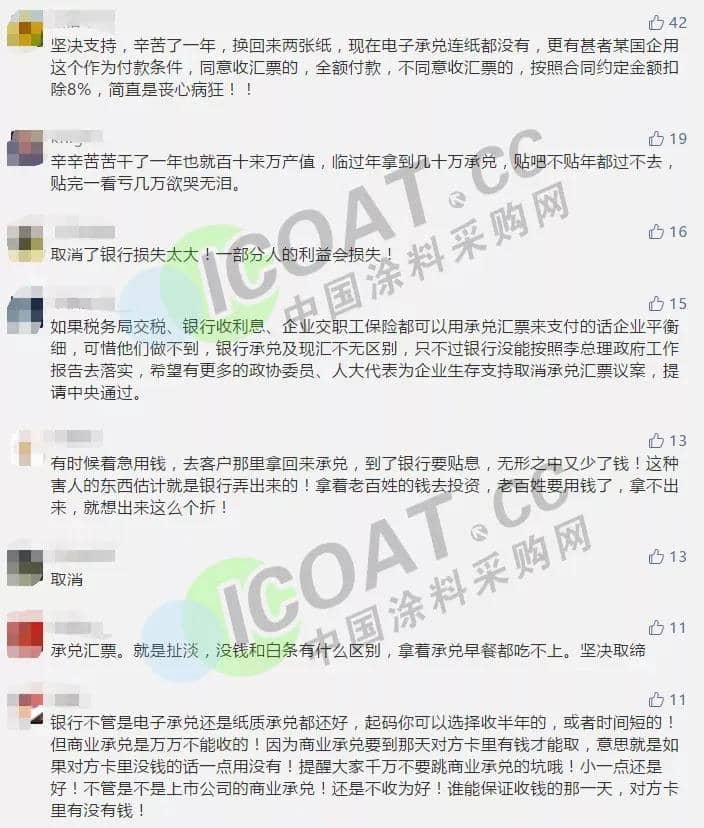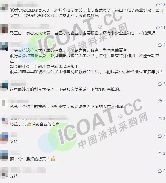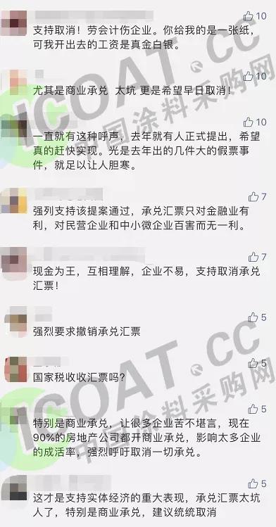 據涂料采購網了解,很多企業對于承兌匯票已經到了忍無可忍的地步了,大部分企業負責人也都支持取消承兌匯票。近日,全國人大代表、吳忠儀表有限責任公司董事長馬玉山表示,今年向兩會提交了一份通過停止增發新的承兌匯票,對現有流通的匯票持有至到期后不再繼續開具等方法逐步取消承兌匯票的使用和流通的建議。該建議的提出,更是受到了很多企業負責人的追捧,瞬間引起了各行各業的討論。