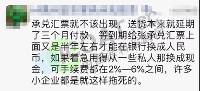 河南某涂料企業負責人表示:承兌匯票就不應該出現,送貨本來就延期了三個月付款,等到期后,買方再給張承兌匯票,又需要等半年才能在銀行換成現金,如果著急用錢,則需要從一些私人那里變現,一般情況下手續費都在2%~6%之間,許多小企業都是這樣被拖死的。