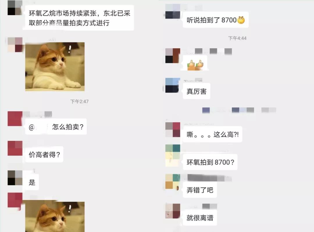 6月初,環氧乙烷價格由5800元/噸飆升至7000元/噸,漲幅超過20%。而近期某化工群里則出現了東北地區部分環氧乙烷產品進行拍賣的情況,拍賣出8700元/噸的高價,令一眾化工人深感不可思議。