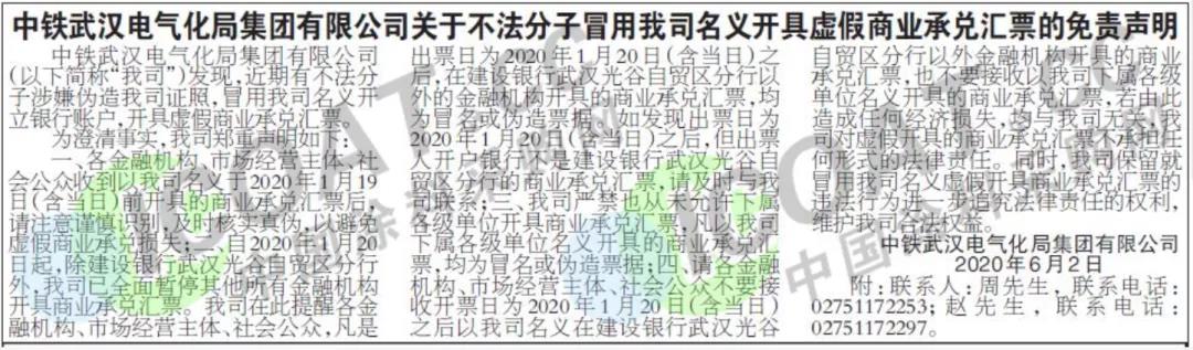請相關金融機構,市場經營主體及社會公眾不要接受開票日期為1月20日(含當日)之后以其名義在建設銀行武漢光谷自貿區分行以外金融機構開具的商業承兌匯票 ,也不要接受其公司下屬各級單位名義開具的商業承兌匯票 。