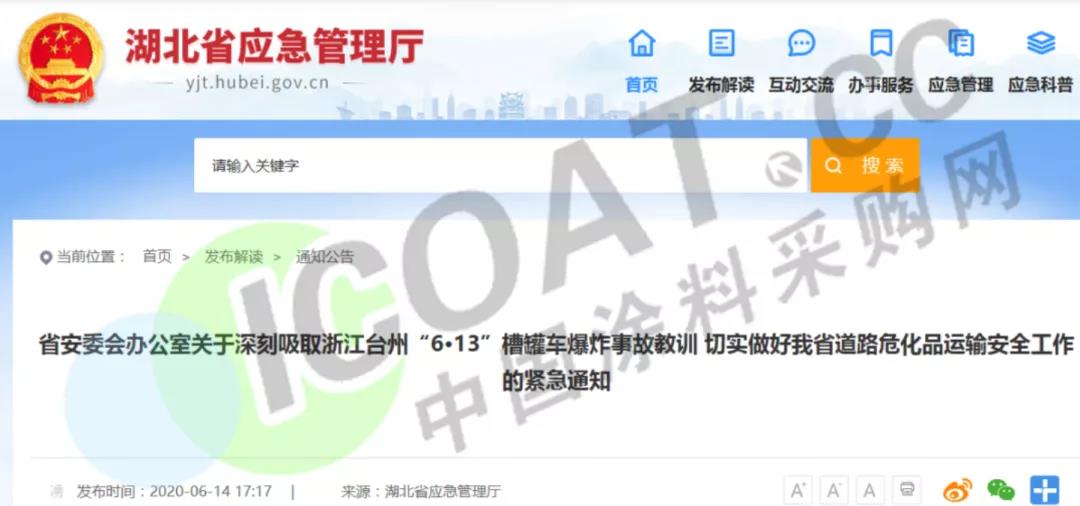 為深刻吸取浙江臺州“6·13”槽罐車爆炸事故教訓,舉一反三,認真做好湖北省道路危化品運輸安全工作,6月14日,湖北省安委辦印發(fā)《關于深刻吸取浙江臺州“6·13”槽罐車爆炸事故教訓 切實做好我省道路危化品運輸安全工作的緊急通知》,主要內(nèi)容如下:
