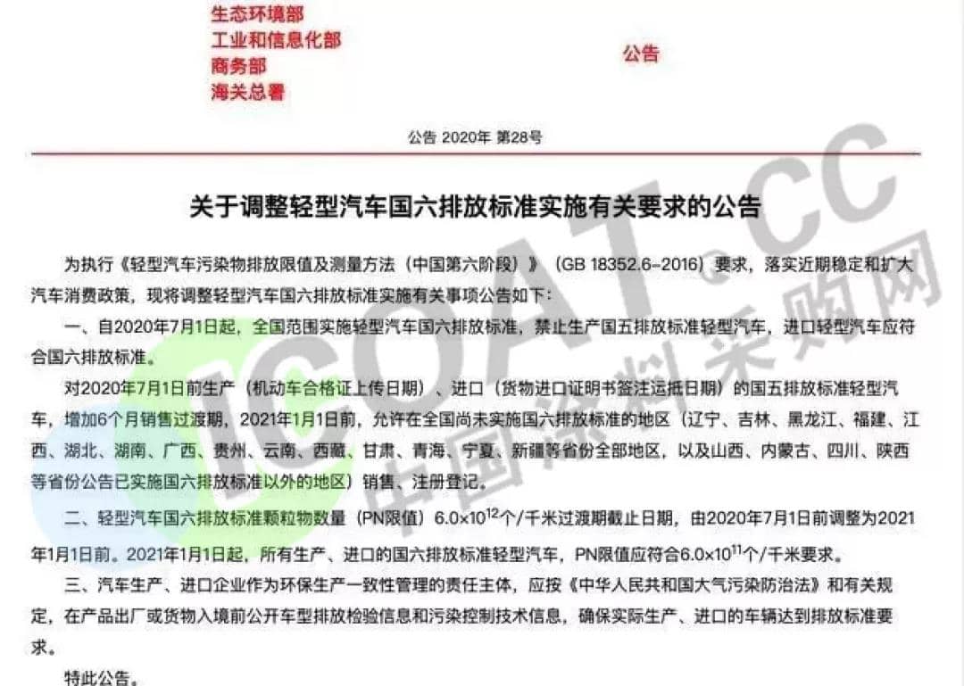 自2020年7月1日起,全國范圍實施輕型汽車國六排放標準,禁止生產(chǎn)國五排放標準輕型汽車,進口輕型汽車應符合國六排放標準。