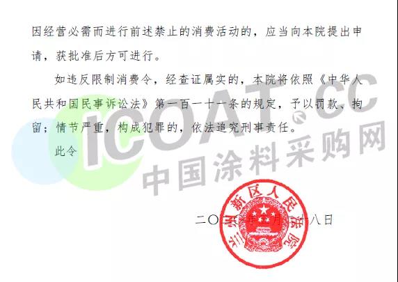 據涂料采購網了解,在涂料行業,不管是拖欠貨款還是因為合同糾紛的案件并不在少數。近日,蘭州市新區人民法院發布限制消費令稱:2020年5月19日立案執行申請人深圳藍色光標互動營銷有限公司申請執行蘭州科天水性科技有限公司合同糾紛一案,因蘭州科天水性科技有限公司未按執行通知書指定的期間履行生效法律文書確定的給付義務,蘭州新區人民法院依照《民事訴訟法》第二百五十五條和《最高人民法院關于限制被執行人高消費及有關消費的若干規定》第一條、第三條的規定,對蘭州科天水性科技有限公司采取限制消費措施,限制蘭州科天水性科技有限公司及蘭州科天水性科技有限公司(法定代表人、主要負責人、影響債務履行的直接責任人員、實際控制人)戴家兵不得實施以下高消費及非生活和工作必需的消費行為: