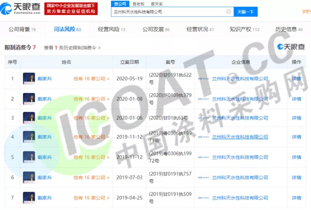 據公開消息顯示,自2019年4月份以來,在近一年多的時間里,蘭州新區人民法院、杭州市蕭山區人民法院等法院先后針對蘭州科天水性科技有限公司執行董事總經理戴家兵發布7次限制消費令。