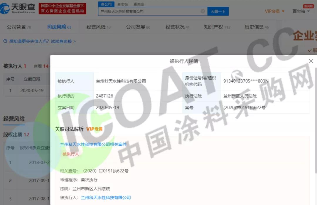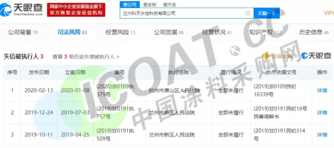 涂料采購網梳理發現,近年來,水性科天從質量門事件到討債門事件,再到失信被執行、限高令,曾經不可一世的水性科天似乎這幾年慢慢走下了“神壇”,各種問題層出不窮。