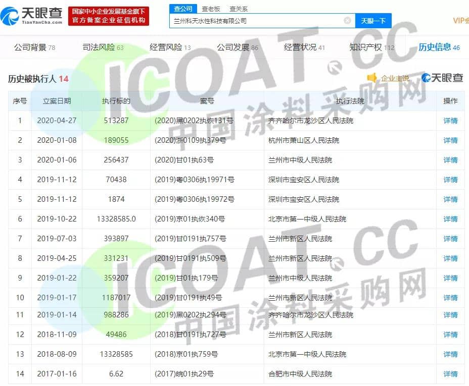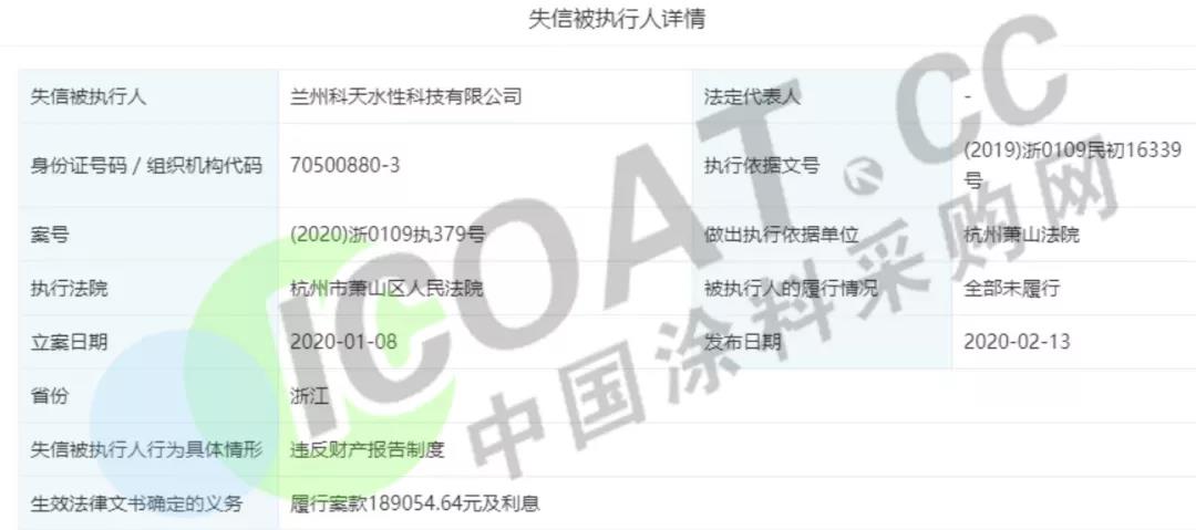 據涂料采購網了解,蘭州科天水性科技有限公司除了強制限消之外,自2019年10月份以來,已經有3次被列入失信被執行人名單了,從公開的失信被執行人行為具體情形來看,最主要的原因是未履行欠款還款義務。在近三年多的時間里,蘭州科天水性科技有限公司先后14次被列入被執行人名單。