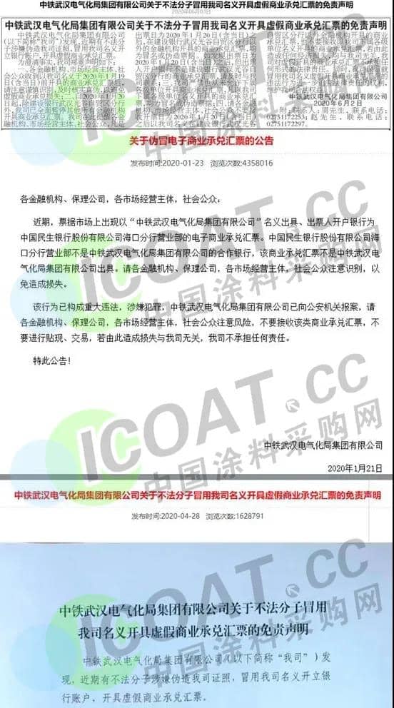 2020年6月,中鐵武漢電氣化局集團有限公司發表聲明稱,近期有不法分子涉嫌偽造證照,冒用其名義開立銀行賬戶,開具虛假商業承兌匯票。提醒凡是出票日期在2020年1月20日(含當日)之后,在建設銀行武漢光谷自貿區分行以外的金融機構開具的商業承兌匯票,均為冒名或偽造票據。企業嚴禁也從未允許下屬各級單位開具商業承兌匯票,凡以其下屬各級單位名義開具的商業承兌匯票,均為冒名或偽造票據。